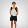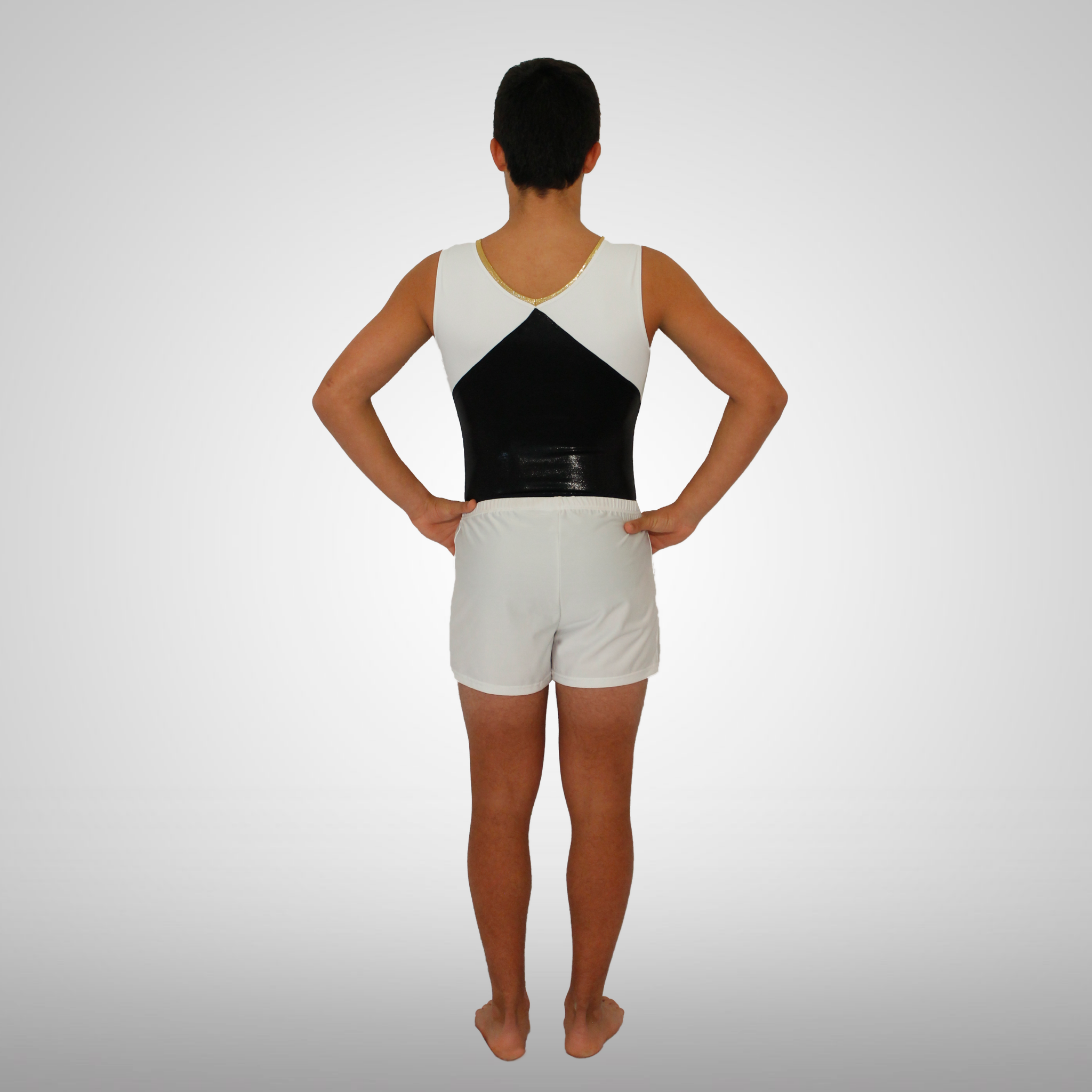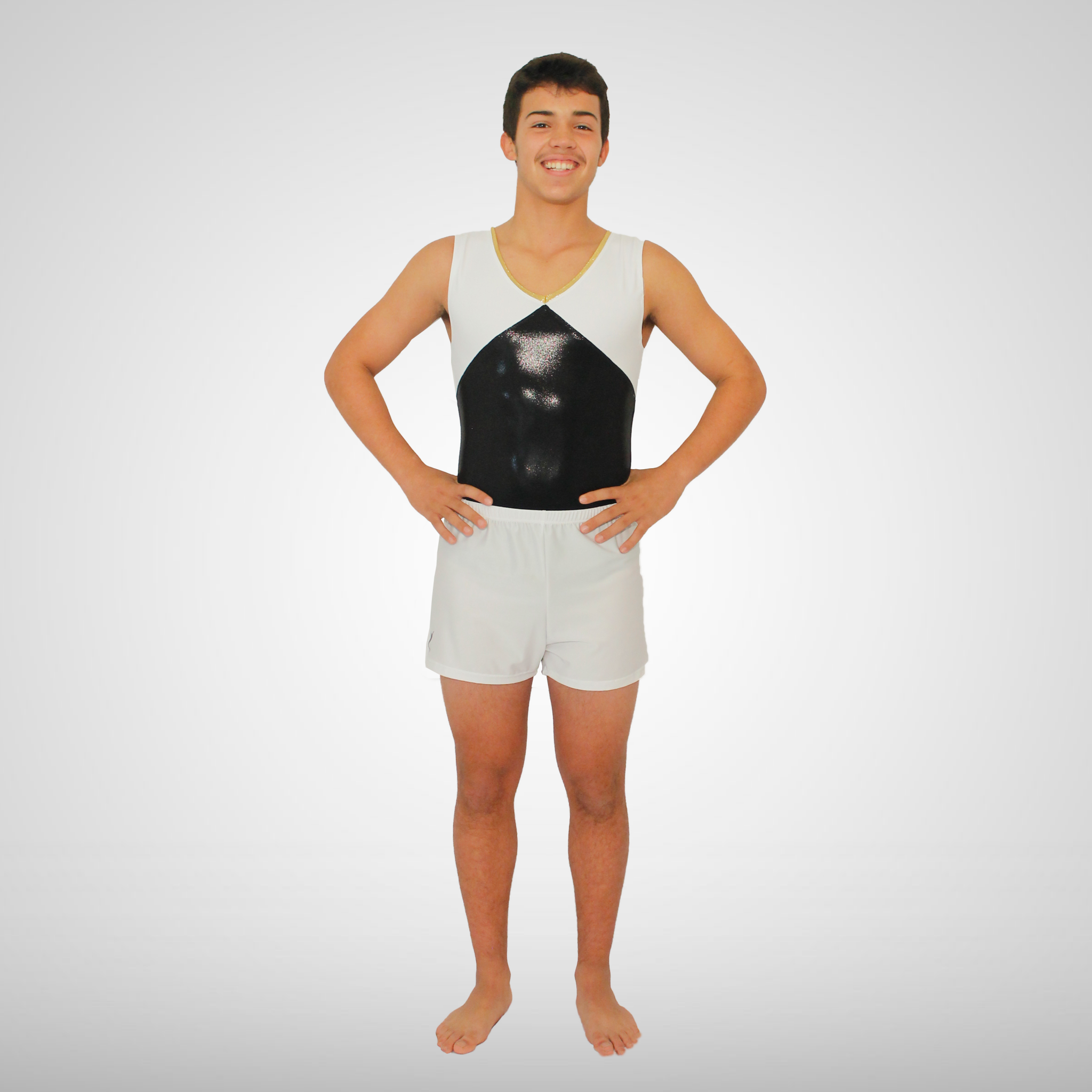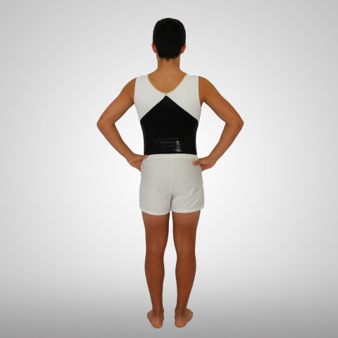 Maillot de ginástica masculino preto brilhante, branco matte e dourado brilhante. Este modelo possui um decote em bico.