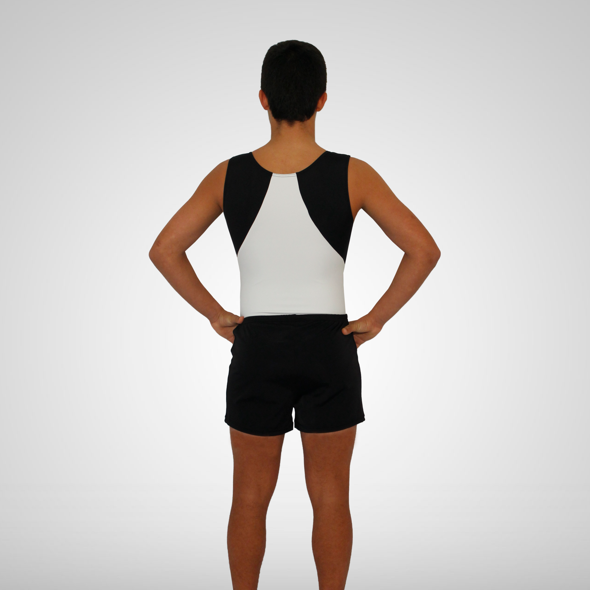 Maillot de ginástica masculino branco e preto. Este modelo possui um decote redondo.